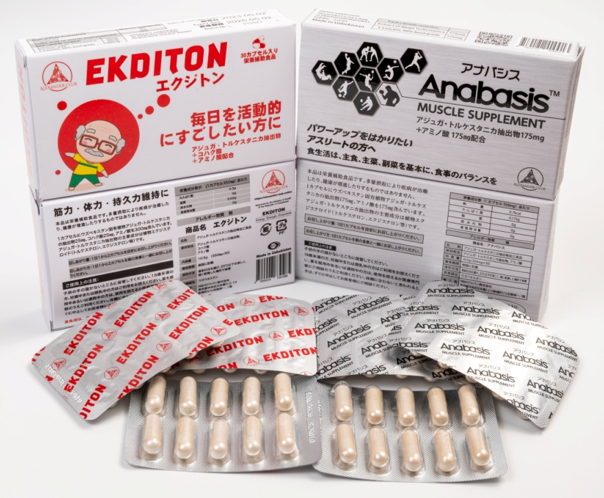 アナバシスはアスリート用として1カプセル当たり175㎎のアジュガ・トルケスタニカ抽出物とアミノ酸175㎎を含んでいる。 アジュガ・トルケスタニカに含まれる植物エクジステロイドの主たる成分であるトルケステロンを最低5%、エクジステロンを最低5%含有している。 これらの成分は天然のアナボリック(筋肉や脂肪などの体の組織を新しく合成すること)成分であり、 プロテインやその他のサプリメントと併用することで一層の筋肉・筋力アップが期待できる。 エクジトンには1カプセル当たり25㎎のアジュガ・トルケスタニカ抽出物とコハク酸25㎎、アミノ酸300㎎を含んでいる。 エクジトンは筋力・体力・持久力維持・疲労回復に人生100年時代を迎えて毎日を活動的に過ごしたい方や、 シニアのスポーツ愛好家に向けたサプリメントだが、もちろんシニア以外のどなたでも利用できる。 コハク酸はお肌の保湿や新陳代謝にも効果があり、トルケステロンやエクジステロンと親和性が高く、効果を持続的に高めることが期待できる。 原料のアジュガ・トルケスタニカは生物多様性条約で守られている希少性植物であり、 その利用はウズベキスタン政府(国家生態環境委員会)の許可が必要であり、 製造元のビオトン社(Bioton LLC)及び本サイトを運営する輸入販売会社のN&Hジャパン株式会社はその許可を取得している。 また、アナバシス、エクジトンともにアレルギー物質を含まず、製造や製造工程において動物由来成分は一切使用していない。 原材料・抽出物には農薬、薬品、昆虫は一切ふくまれていない。商品はすべてウズベキスタン政府により国家衛生基準に従った検査を受け合格したものである。